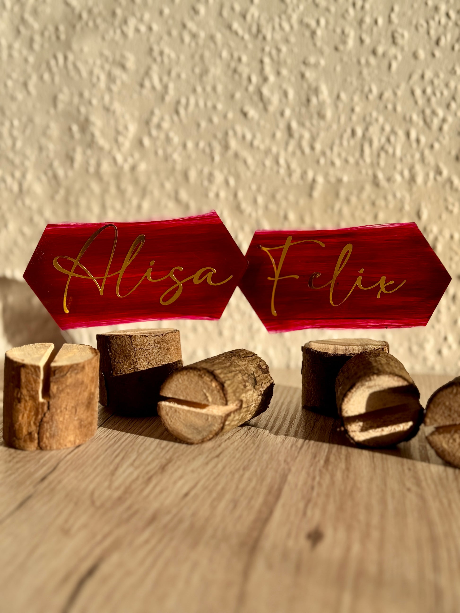 Unsere rustikalen Holzkartenhalter aus echten Holzästen sind die perfekte Wahl, um Namenskarten, Menükarten oder kleine Tischhinweise dekorativ zu präsentieren. Sie verleihen deinem Event einen natürlichen und authentischen Look.