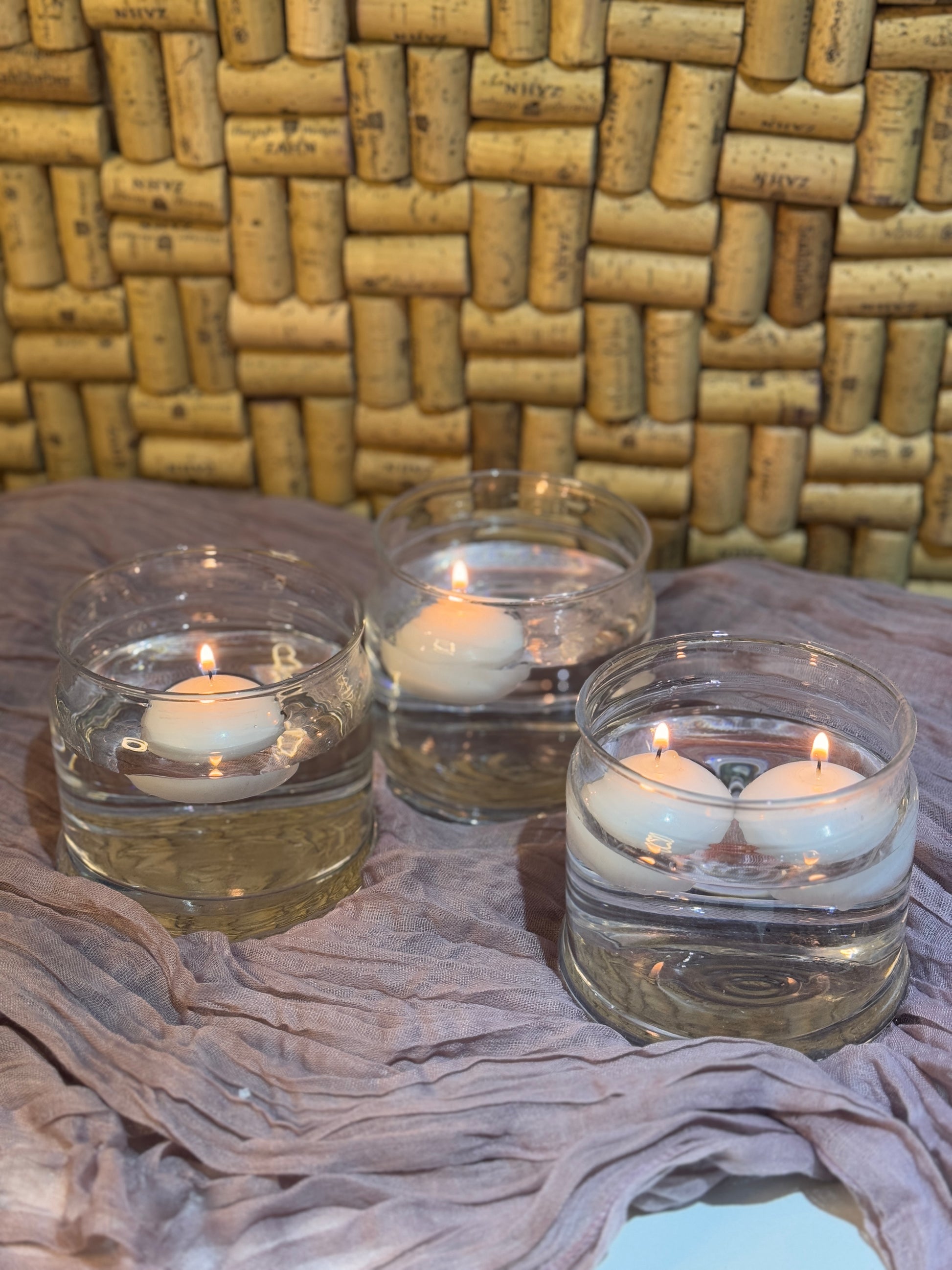 Unsere schlichten Kerzenbecher „Selva“ aus Glas eignen sich perfekt für schwimmende Kerzen und sorgen für eine warme, ruhige Atmosphäre. Mit ihrer klaren Form lassen sie sich in jedes Eventkonzept integrieren.