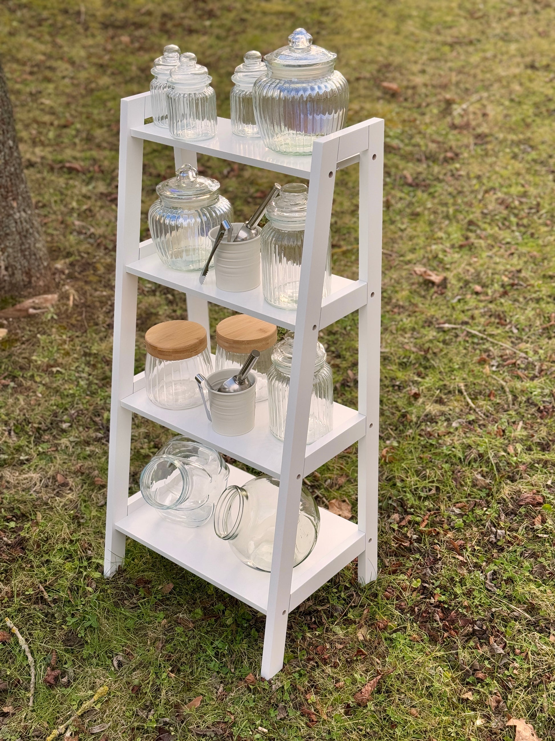 Das Leiterregal ist flexibel einsetzbar – ob Hochzeit, Geburtstag oder Firmenfeier – und bietet eine dekorative Möglichkeit, Leckereien oder Dekoration charmant in Szene zu setzen.